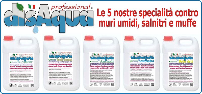 Ad uso specifico con macchina a vapore o pennello, eccellente per rimuovere muffe, batteri e smog dalle superfici e dai muri, ridonando traspirabilità agli intonaci. La semplicità d’uso e la completa atossicità ne permette l’uso domestico fai da te per casi di muffe ed umidità muraria. La speciale formulazione risana ogni tipo di problematica muraria. E’ sempre consigliato come trattamento iniziale e come primer anche per i trattamenti più specifici della famiglia disAqua.